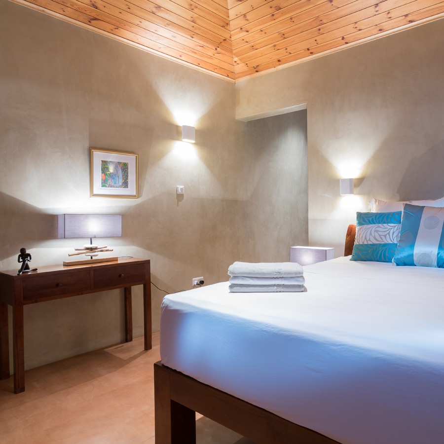 Královské okamžiky Vás čekají v naší vile Queen zajišťující luxusní ubytování na Seychelech. Vila o celkové kapacitě 6 osob disponuje třemi ložnicemi, z nichž jedna má status Masterbedroom s postelí King size, v ostatních dvou ložnicích jsou postele Queen size. Každá ložnice má vlastní koupelnu vybavenou špičkovými výrobky značek Villeroy & Boch a Axor Massaud, koupelna hlavní ložnice této vily je opatřena designovou vanou. Všechny ložnice jsou plně klimatizované, obývací pokoj a prostor terasy je opatřen stropními větráky. Celý interiér vily je vybaven stylovým masivním nábytkem z Bali. Obývací zóna skýtá dostatečné pohodlí jak pro relaxaci či lenošení, tak pro sledování filmů či poslouchání hudby díky audiovizuální technice, připojení k internetu a wifi. Prostorná terasa s denní postelí a ratanovým sezením nabízí překrásný výhled na oceán. Vila Queen disponuje vlastním bazénem s přepadem. U bazénu se nachází venkovní kuchyňka s minibarem. O blaho Vašich chuťových pohárků se bude starat privátní Chef, který je plně k dispozici pouze pro Vás. Sečtěno podtrženo - Vaše bydlení na Seychelech připravíme přesně pro Vás !